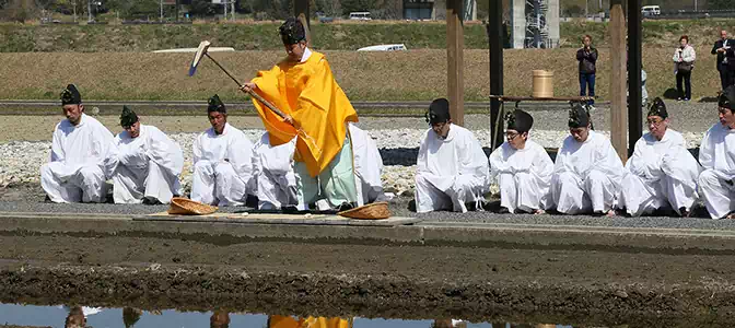 神田では、稲の育成の節目に豊かな稔りを願うお祭りも行われます。4月には神田下種祭、5月には神田御田植初、9月には抜穂祭が古式ゆかしく行われます。