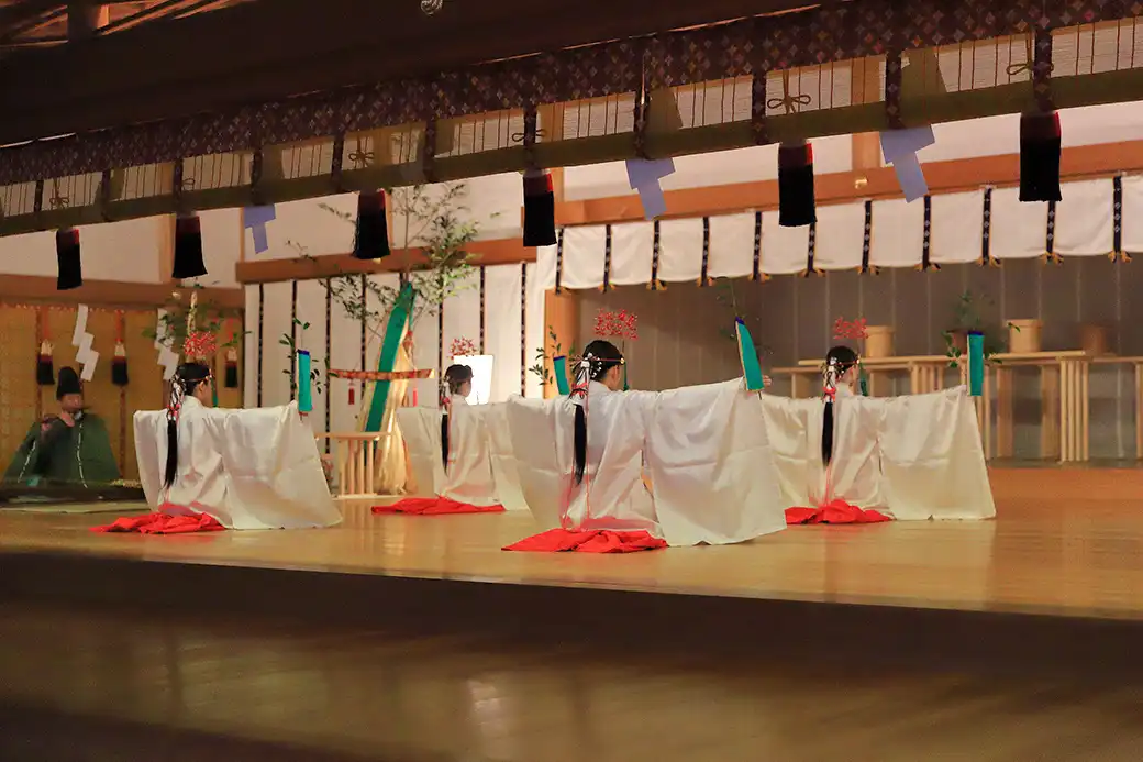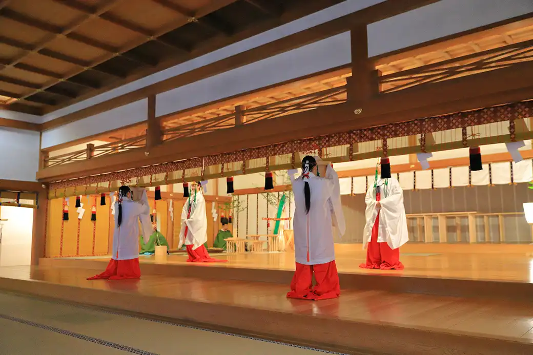 神楽殿にてご祈祷に際し神宮に伝わる舞の奉仕を行います。お神札・お守りの授与や参拝者の接遇等もしていただきます。奉仕期間は高校卒業後5年間ですが、希望があれば奉仕成績により他の職種で継続して奉仕も可能です。茶道・生花・洋裁和裁等を習得する時間も設けており、各種資格取得の補助もしております。