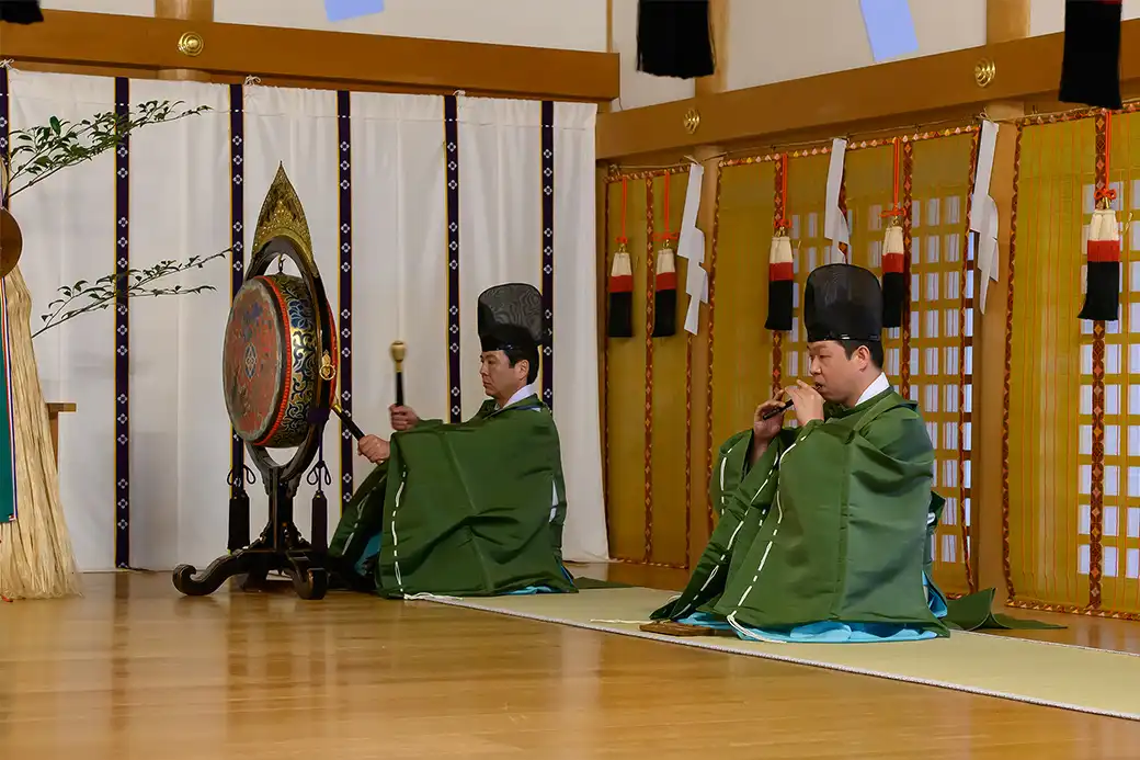 日本古来の和楽器(笛・笙・篳篥など)や舞楽の教養と技術を身につけ、神宮の祭事及び神楽殿のご祈祷において奏楽をします。採用されましたら、まず楽生という職種で奏楽の技術を学びます。
