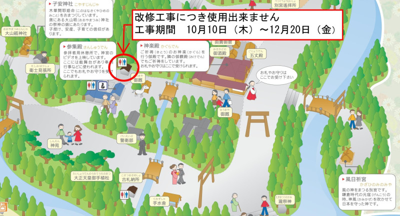 下記の期間中、内宮裏参道トイレの改修工事を行いますので、工事期間中は表参道、もしくは参集殿のトイレをご利用頂きますよう、ご協力をお願いします。工事期間 10月10日(木)~12月20日(金)